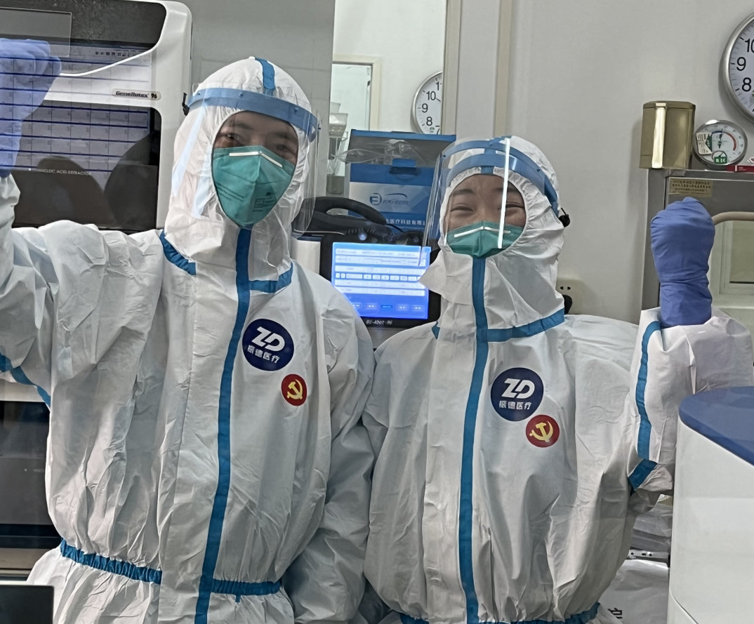 团委委员朱飞龙,医技团支部委员吴晓天与钱赛健三位帅小伙搬进PCR实验室旁的临时宿舍已经忘了多久了,他们和另外6名同事轮番上阵,不分昼夜,24小时全天候奋战在核酸标本检验工作一线。他们直面病毒感染风险,与时间赛跑,支撑着医院防控工作。纵有万般不舍,唯遵一声号令,留在照片中的全副武装的身影,是他们一生难忘的抗疫日记。