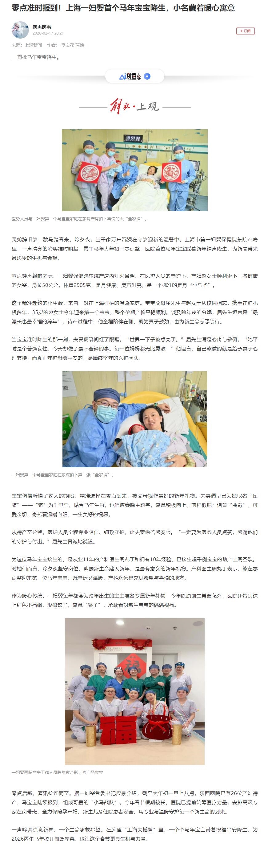 零点准时报到!上海一妇婴首个马年宝宝降生,小名藏着暖心寓意