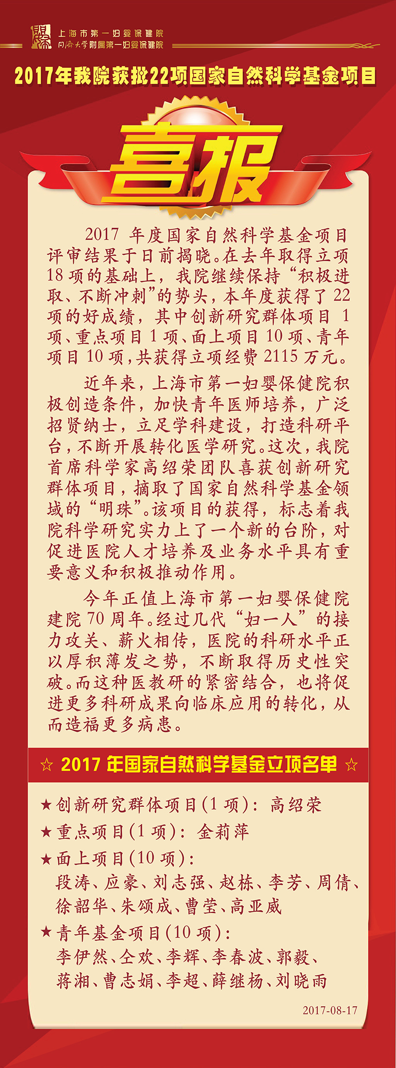 厉害了word一妇婴:2017年我院获批22项国家自然科学基金项目