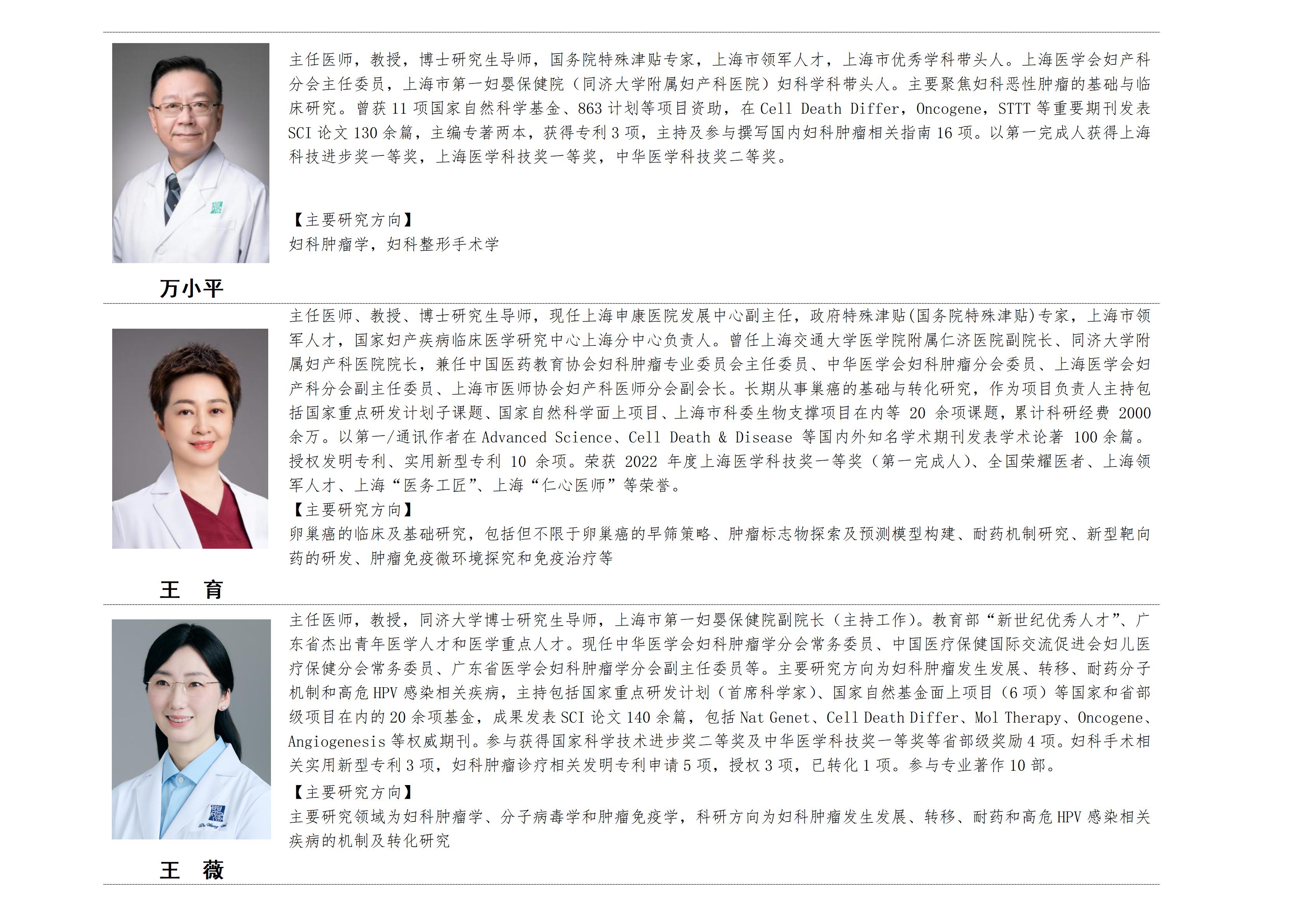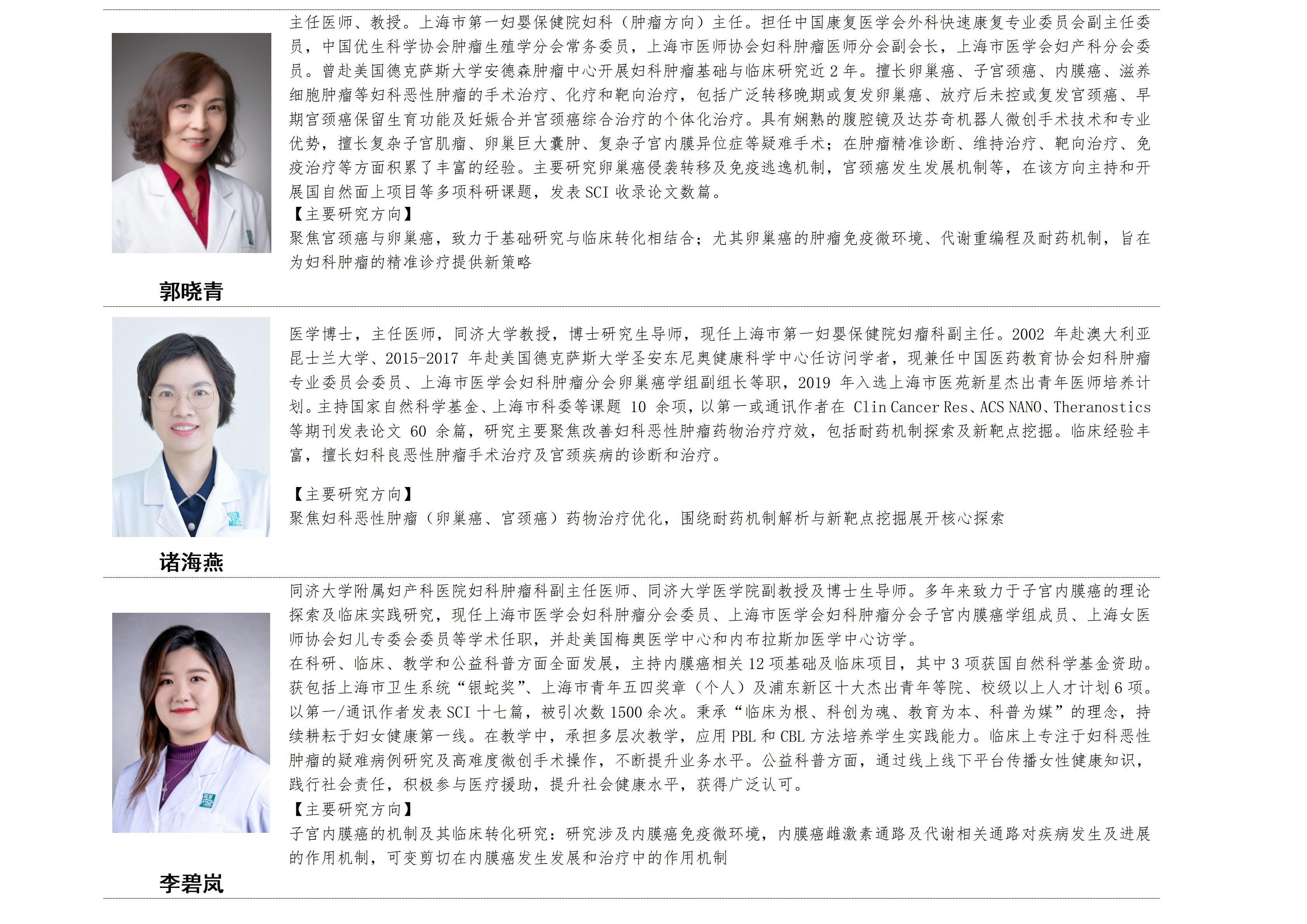 | 诸海燕 | 聚焦妇科恶性肿瘤(卵巢癌、宫颈癌)药物治疗优化,围绕耐药机制解析与新靶点挖掘展开核心探索 | zhuhaiyandoc@sina.com | |