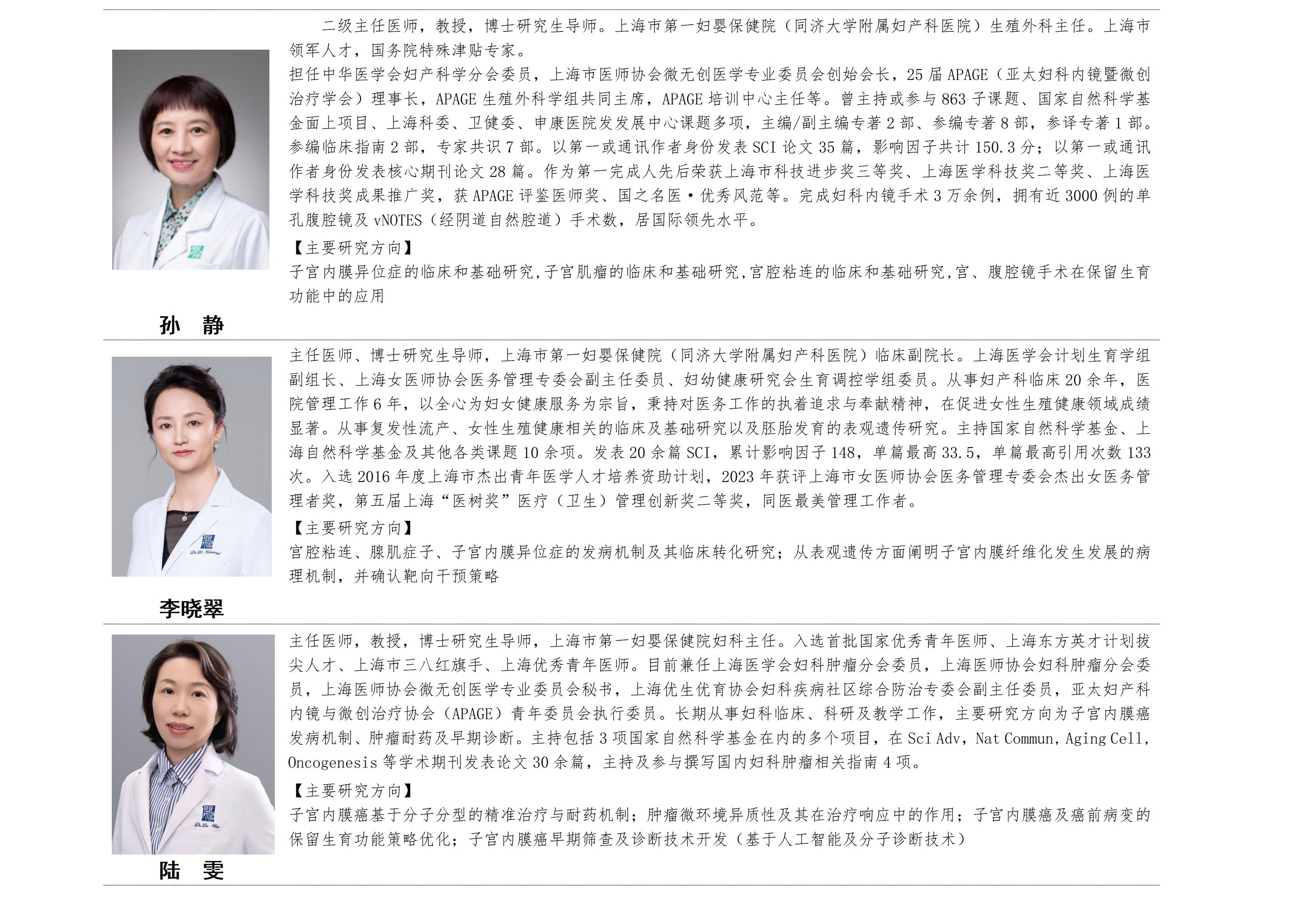 | 陆雯 | 子宫内膜癌基于分子分型的精准治疗与耐药机制;肿瘤微环境异质性及其在治疗响应中的作用;子宫内膜癌及癌前病变的保留生育功能策略优化;子宫内膜癌早期筛查及诊断技术开发 | luwendr@126.com | |