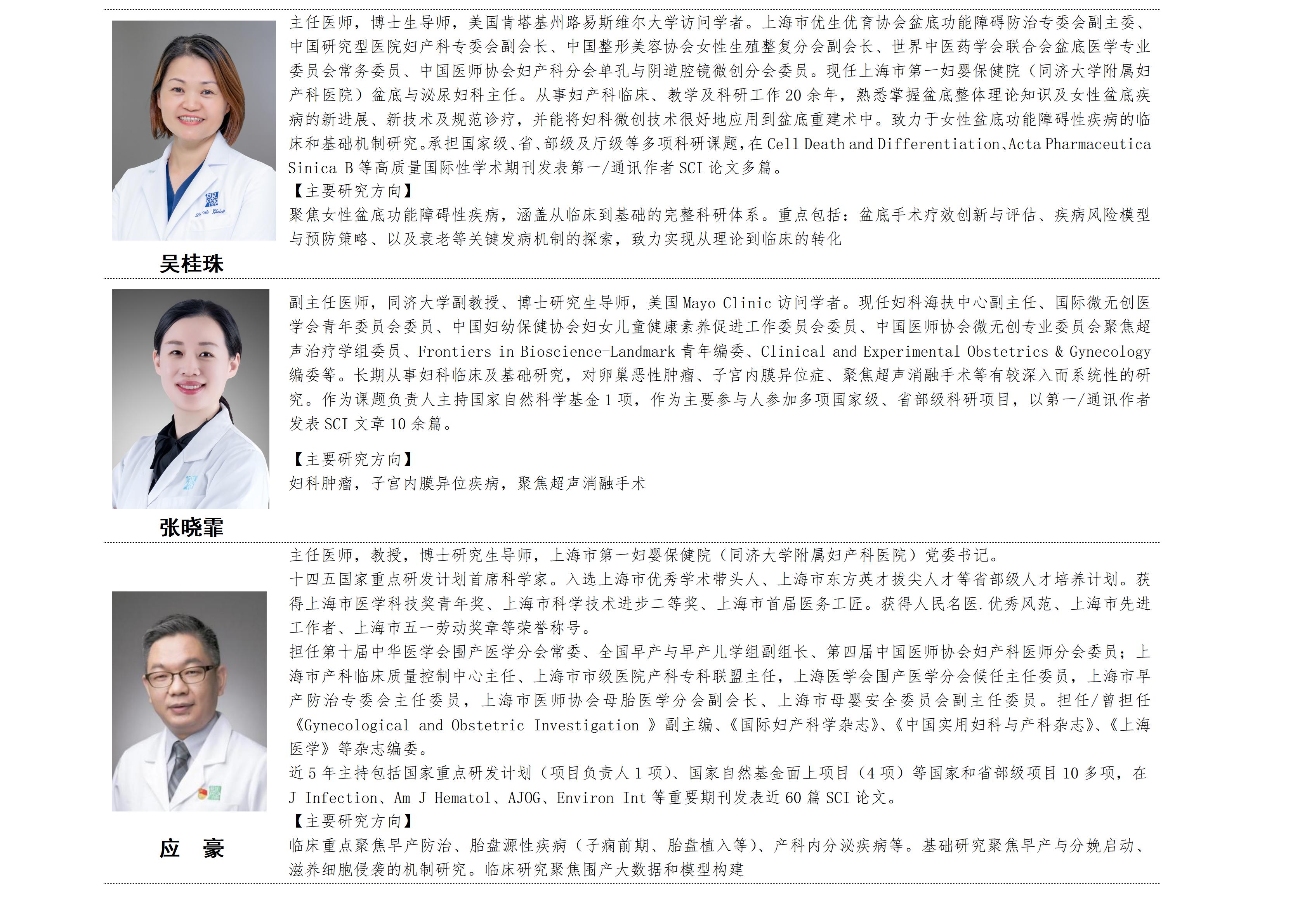 | 吴桂珠 | 聚焦女性盆底功能障碍性疾病,重点包括:盆底手术疗效创新与评估、疾病风险模型与预防策略、以及衰老等关键发病机制的探索,致力实现从理论到临床的转化 | wugz6666@tongji.edu.cn | |