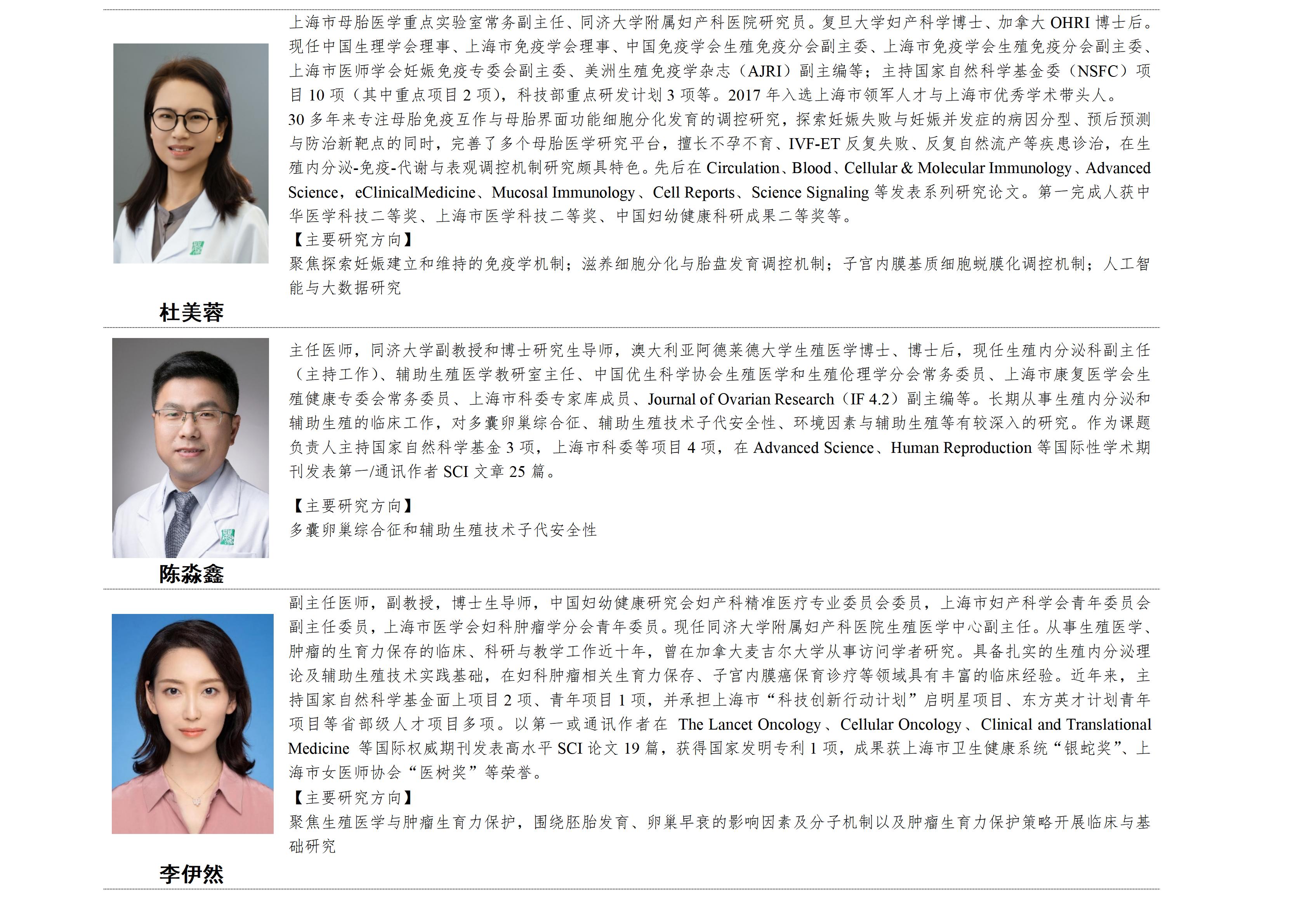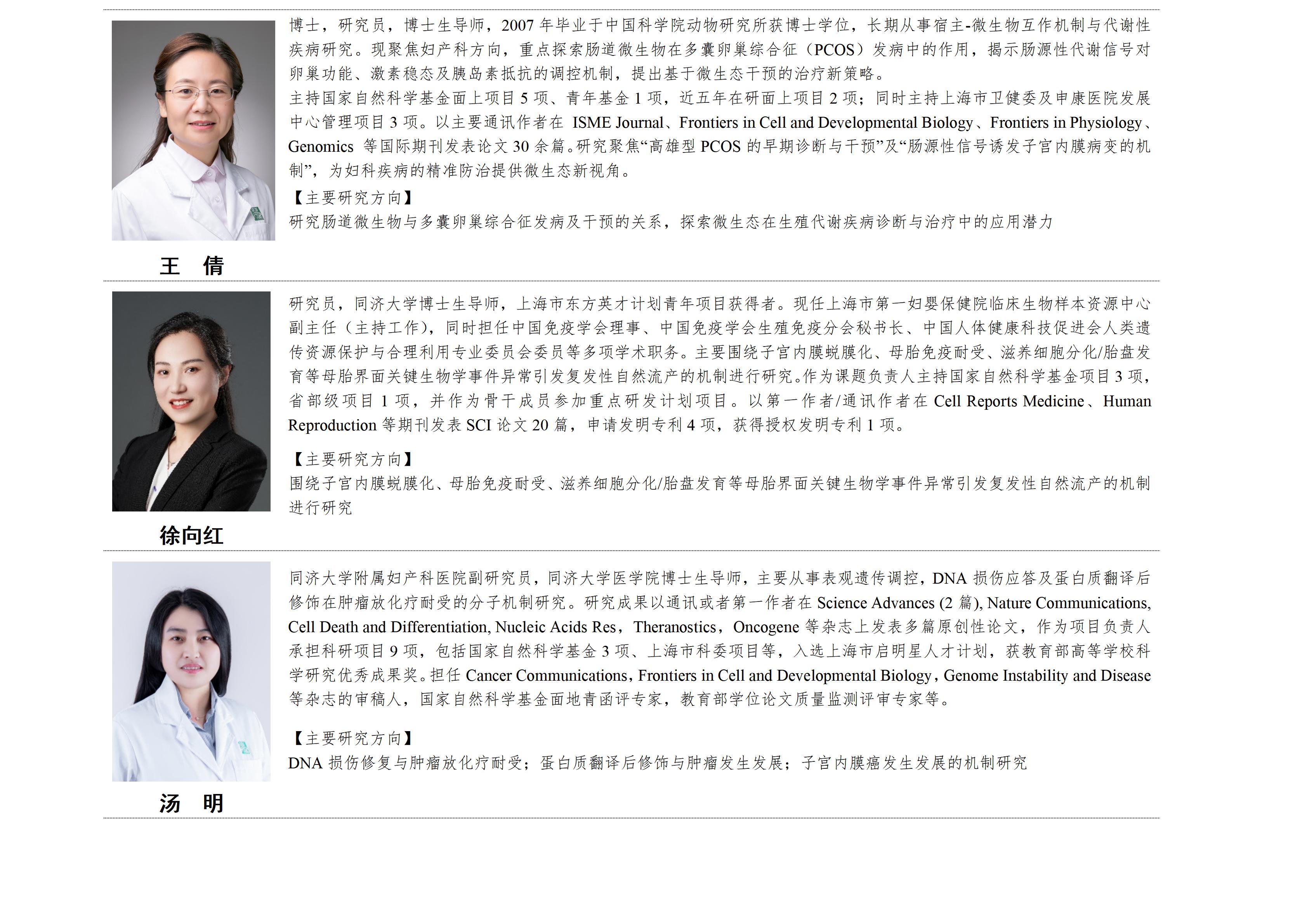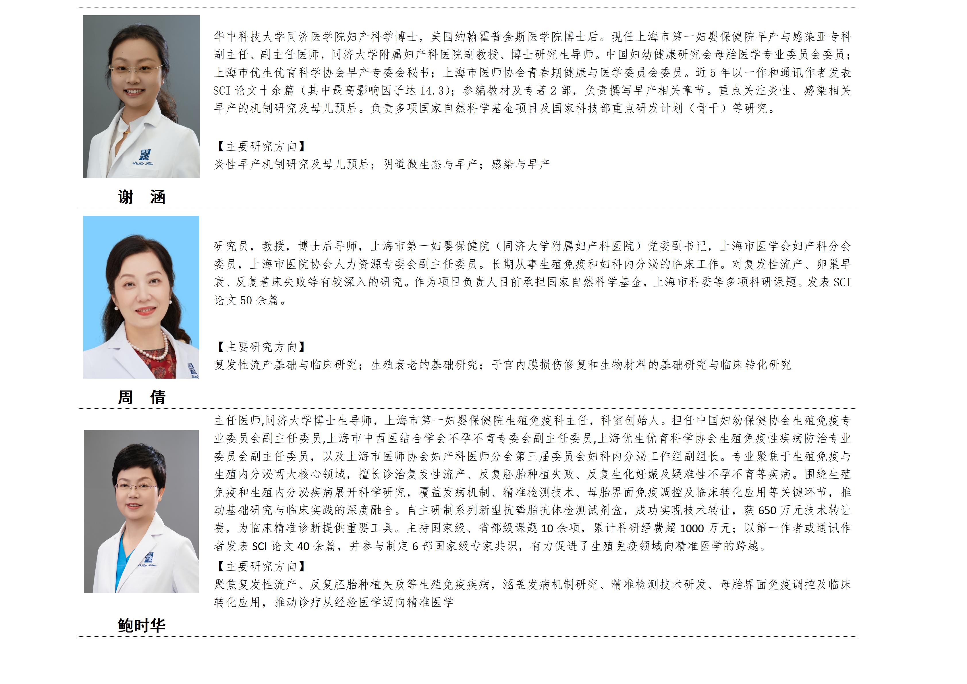 | 鲍时华 | 聚焦复发性流产、反复胚胎种植失败等生殖免疫疾病,涵盖发病机制研究、精准检测技术研发、母胎界面免疫调控及临床转化应用,推动诊疗从经验医学迈向精准医学 | baoshihua@tongji.edu.cn | |