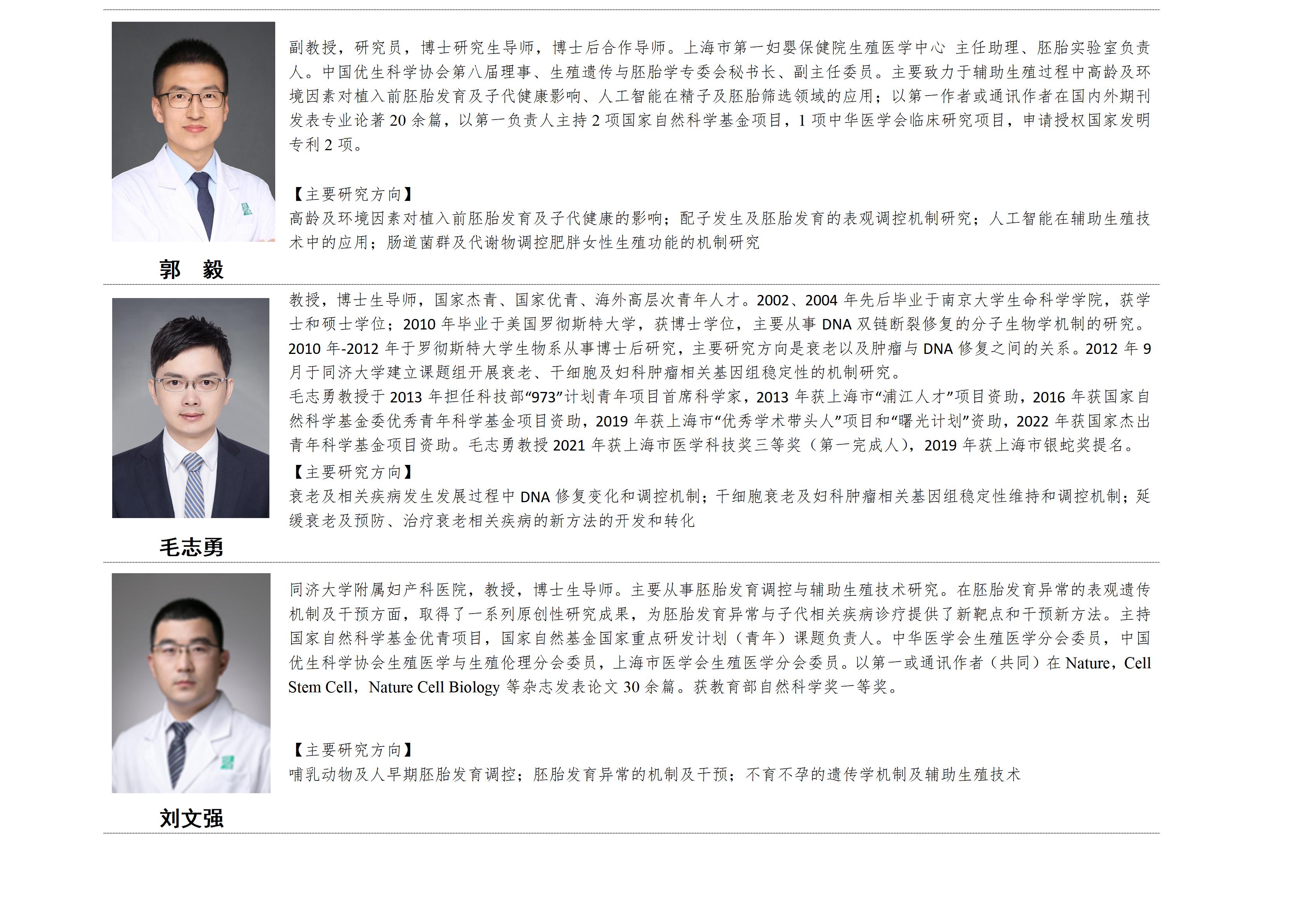 | 郭毅 | 高龄及环境因素对植入前胚胎发育及子代健康的影响;配子发生及胚胎发育的表观调控机制研究;人工智能在辅助生殖技术中的应用;肠道菌群及代谢物调控肥胖女性生殖功能的机制研究 | gy_guoyi@tongji.edu.cn | |