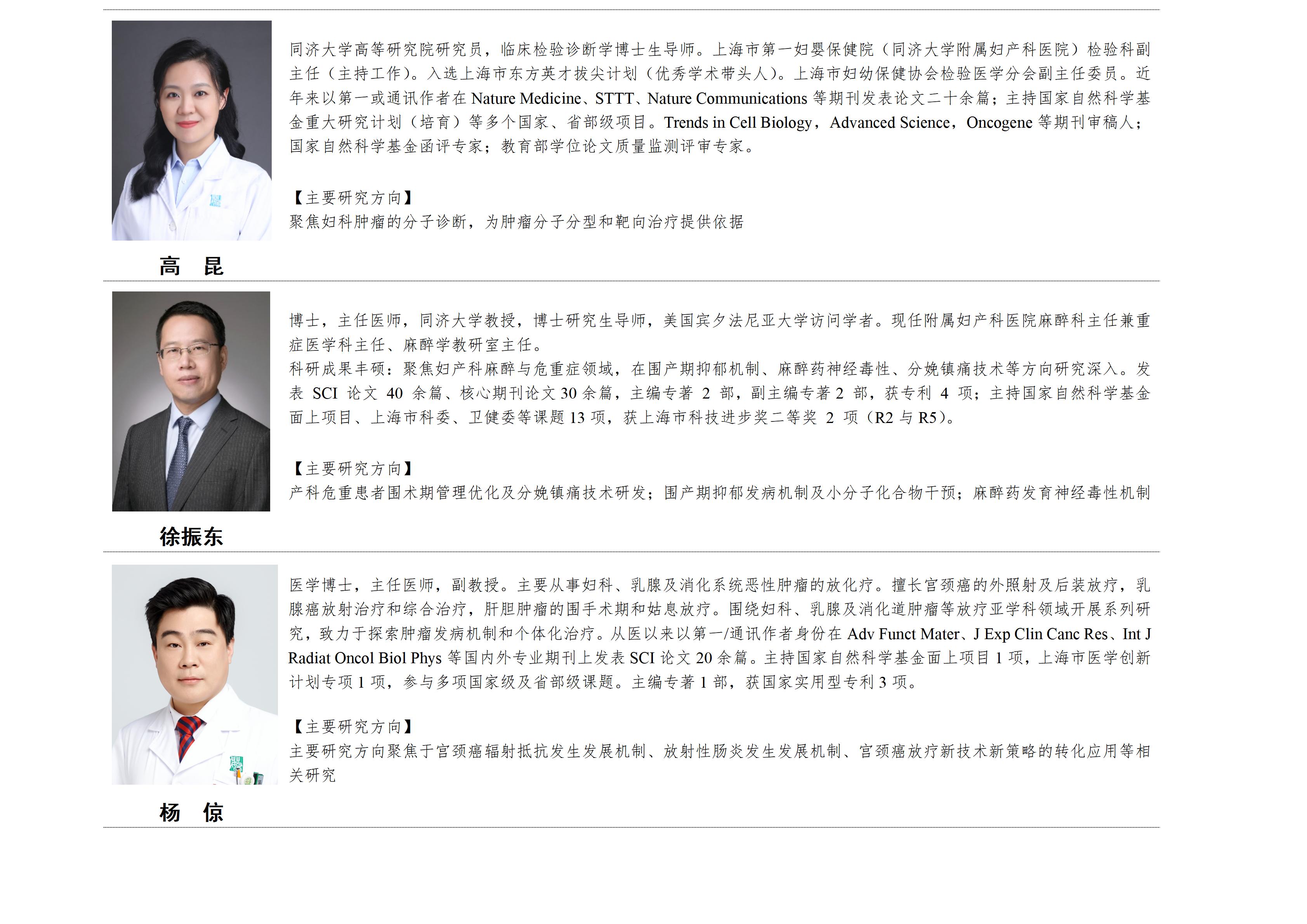 | 郭晓青 | 聚焦宫颈癌与卵巢癌,致力于基础研究与临床转化相结合;尤其卵巢癌的肿瘤免疫微环境、代谢重编程及耐药机制,旨在为妇科肿瘤的精准诊疗提供新策略 | xiaoqing_guo@tongji.edu.cn | |