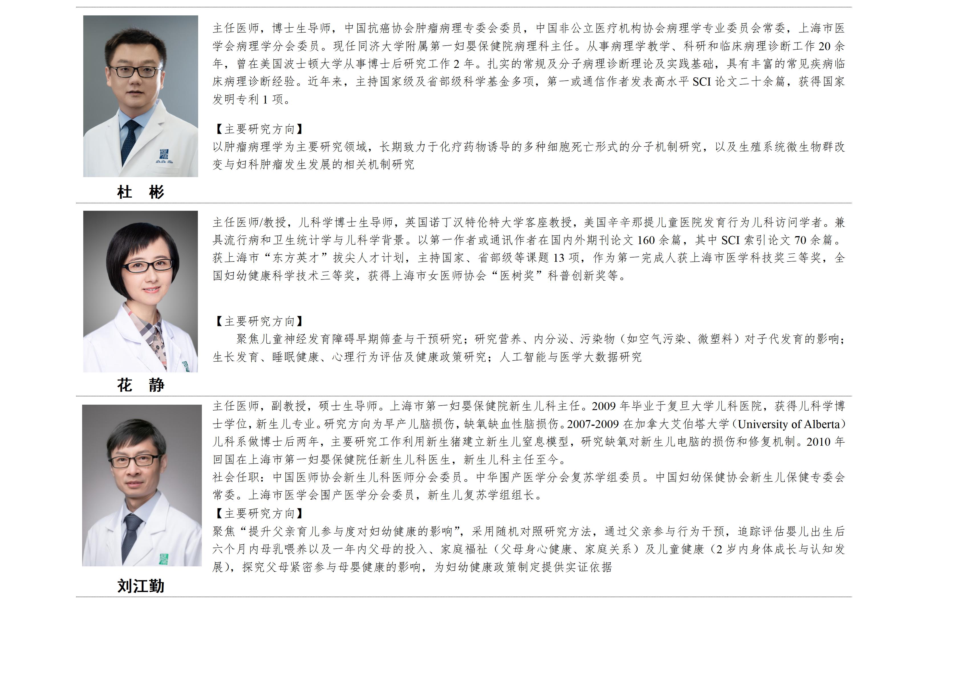 | 产科 | 应豪 | 临床重点聚焦早产防治、胎盘源性疾病(子痫前期、胎盘植入等)、产科内分泌疾病等。基础研究聚焦早产与分娩启动、滋养细胞侵袭的机制研究。临床研究聚焦围产大数据和模型构建 | stephenying2011@126.com |