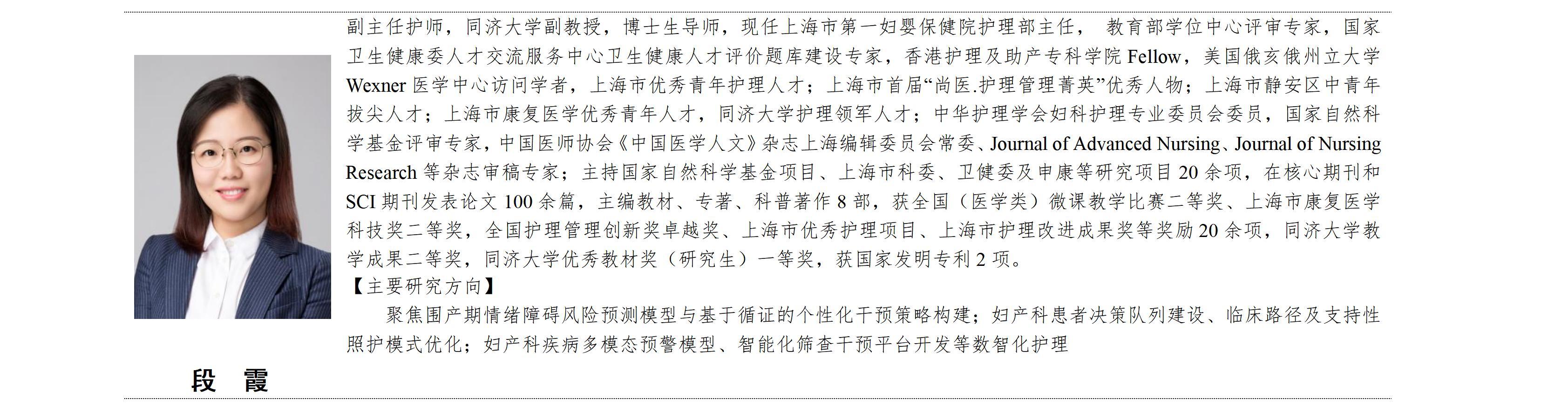 | 段霞 | 聚焦围产期情绪障碍风险预测模型与基于循证的个性化干预策略构建;妇产科患者决策队列建设、临床路径及支持性照护模式优化;妇产科疾病多模态预警模型、智能化筛查干预平台开发等数智化护理 | bamboo-714@163.com |
