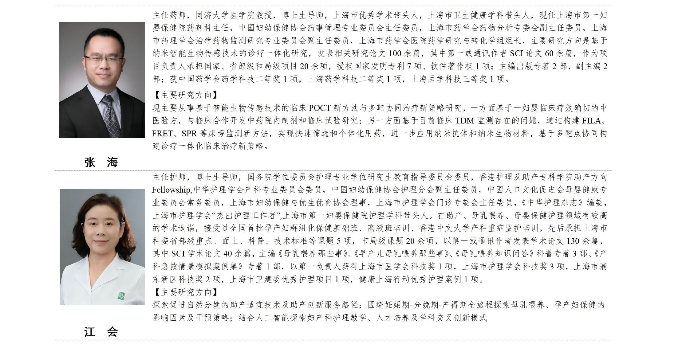 | 护理学 | 江会 | 探索促进自然分娩的助产适宜技术及助产创新服务路径;围绕妊娠期-分娩期-产褥期全旅程探索母乳喂养、孕产妇保健的影响因素及干预策略;结合人工智能探索妇产科护理教学、人才培养及学科交叉创新模式 | jianghui@51mch.com |